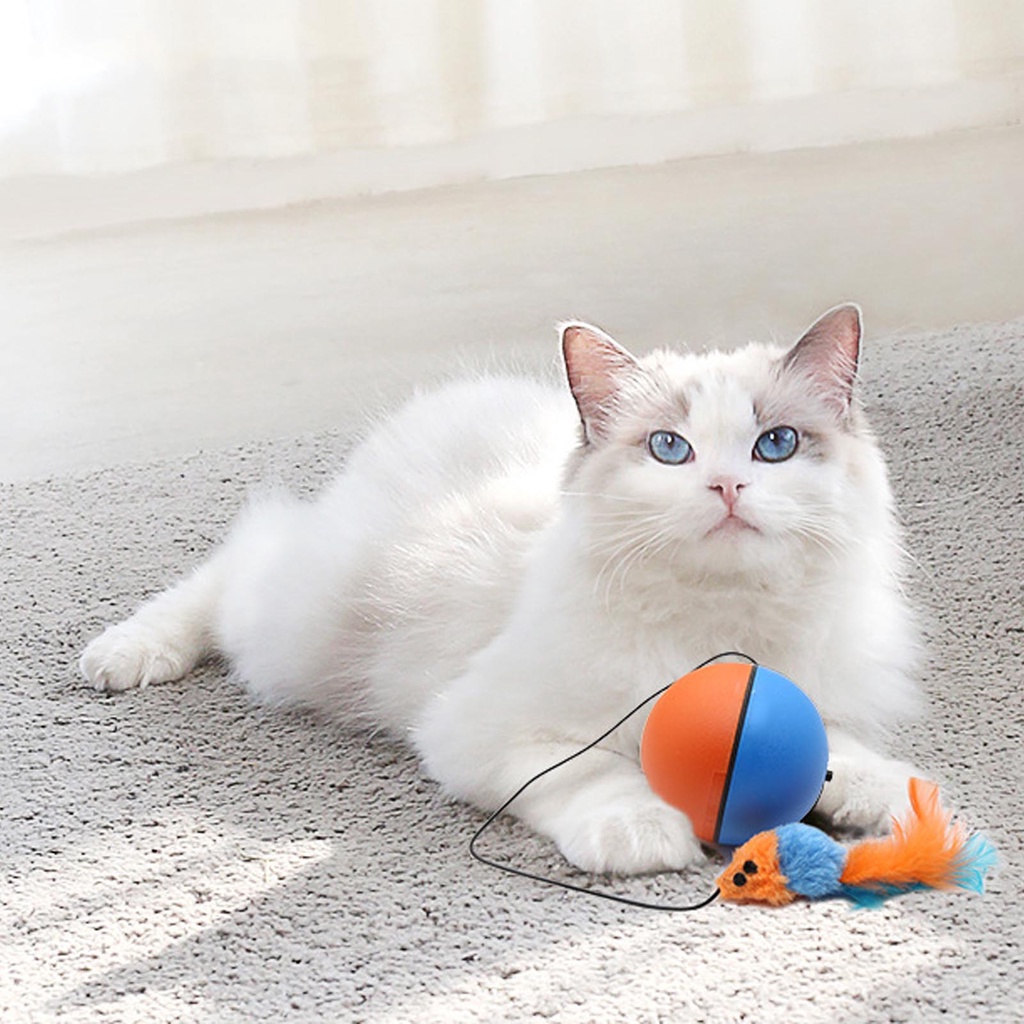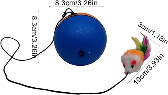 توپ از دو رنگ چشمنواز نارنجی و آبی ساخته شده و به یک عروسک موش پشمالوی رنگارنگ وصل شده که هنگام حرکت توپ، دنبال اون کشیده میشه. این طراحی هوشمندانه، باعث فعال شدن حس کنجکاوی و بازی در گربهها میشه.